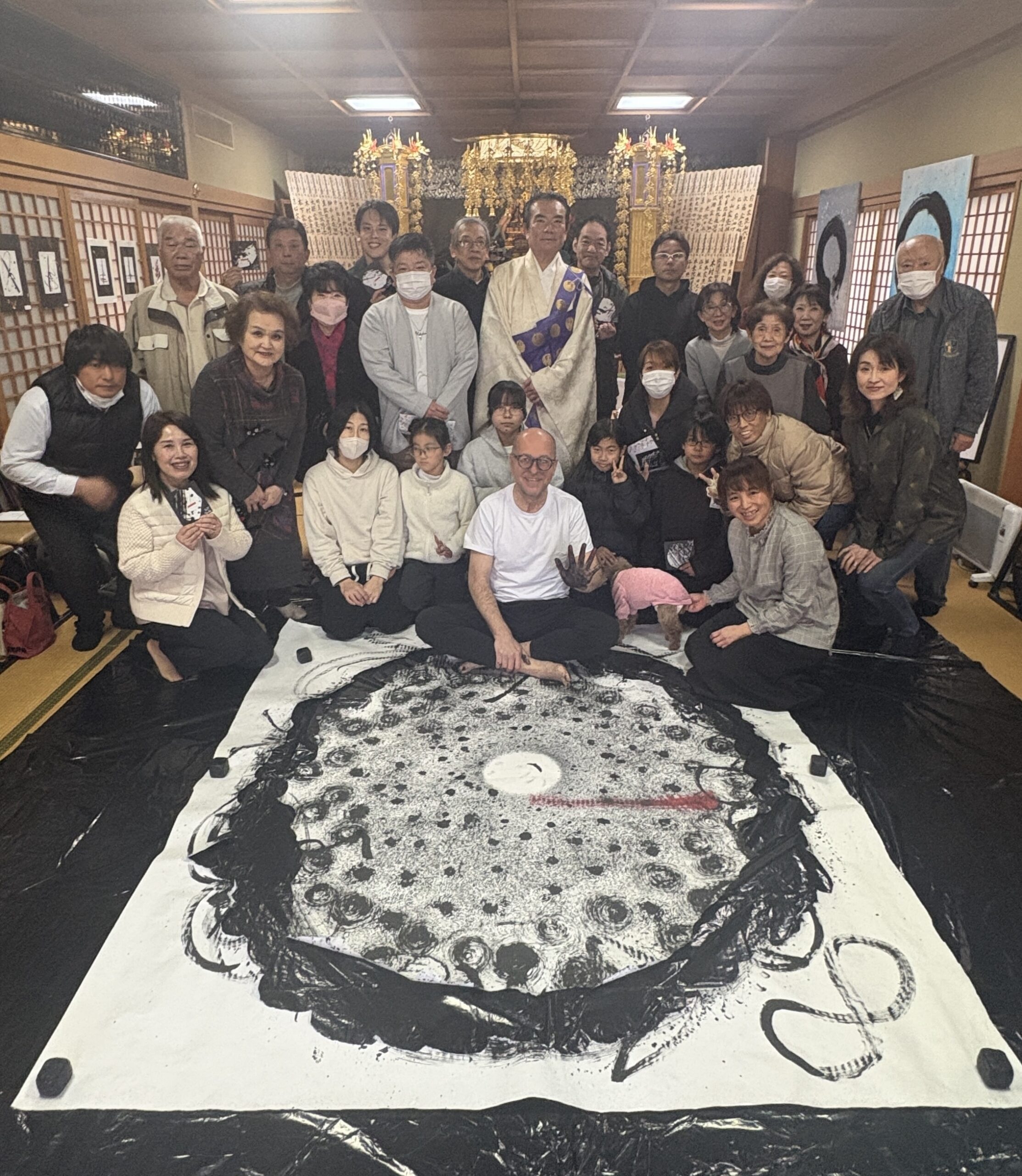 For the first time, the sacred atmosphere of Shofukuji Temple in Kawanishi hosted an Ichigo Ichie Live Painting Performance. The participants were deeply engaged, actively contributing to the final artwork. It was a powerful moment of collective stillness and creation, where everyone involved helped shape a unique piece of art that can never be repeated.
